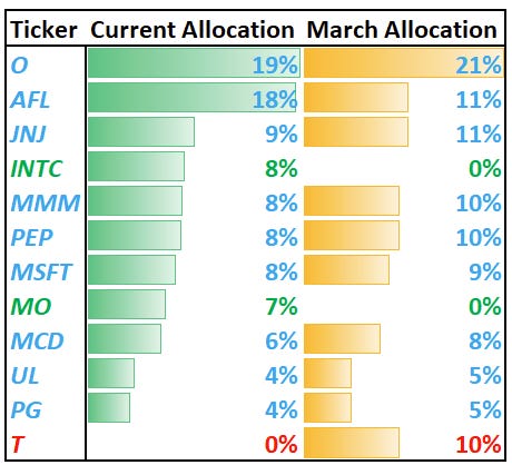 While the bulk of the portfolio has remained the same, some of the allocations have changed, and we removed one Company (AT&T) and added 2 others, Intel and Altria.