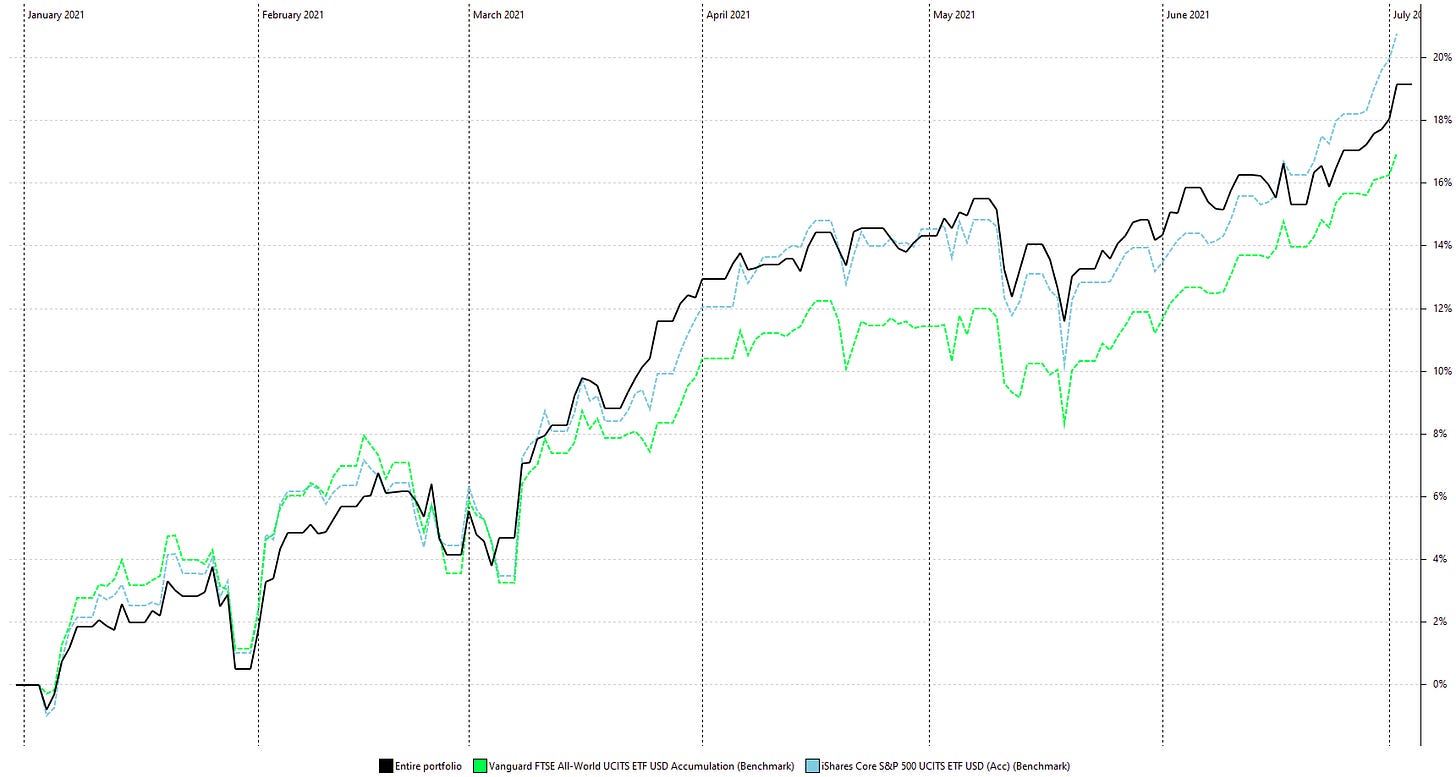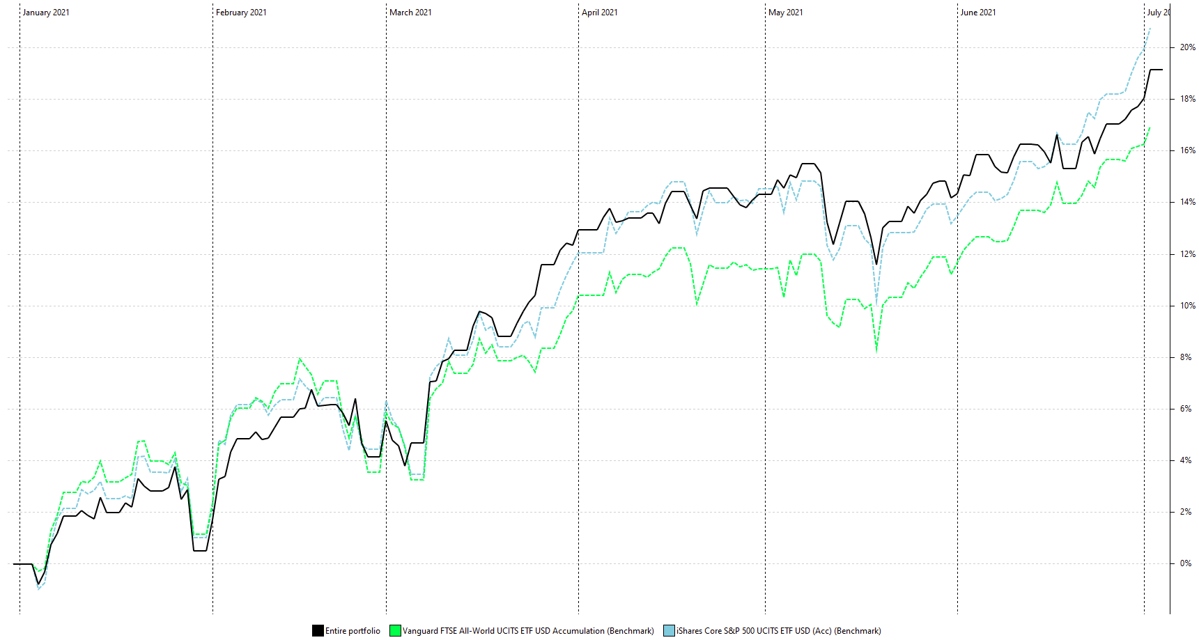 That said I consistently outperformed the FTSE All-World benchmark, and up to the last couple of weeks was regularly beating the S&P500 since early march. Given that I’m being “dragged down” by VWCE which is my largest holding and which is tracking the FTSE All-World index, I would say I did a fair job.