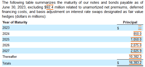 If we assume a “steady state” of the business, where there is no accretive dillution to the shareholders (ie: they issue no more share because the current valuation is not attractive), then we can see that over the next 5 years they will need to issue around $5 to $6 Billion in debt to refinance their current outstanding loans.